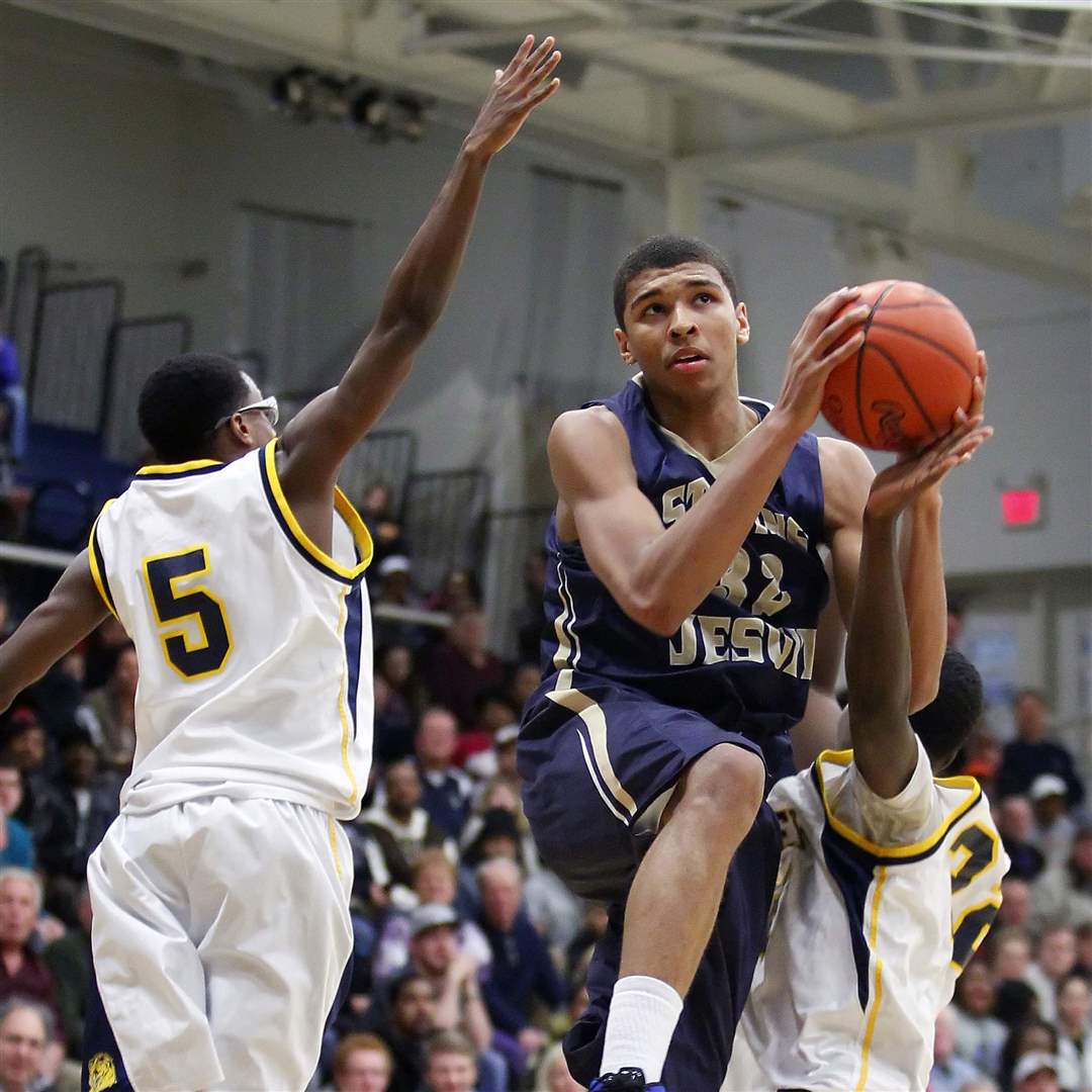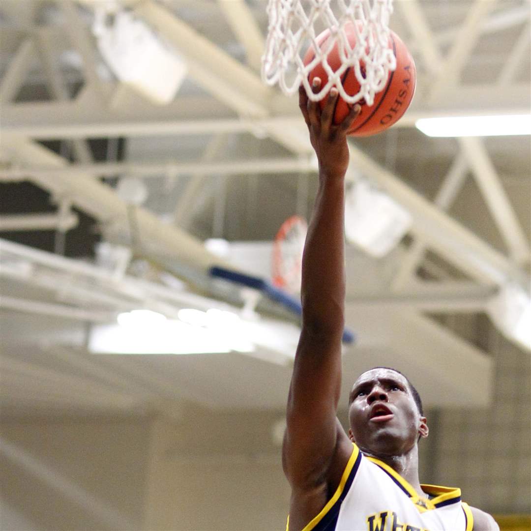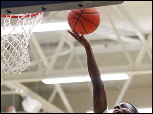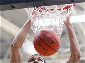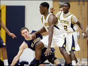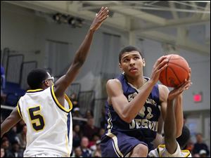 Whitmer's Nigel Hayes goes to the hoop against St. John's Jesuit's Anthony Glover.