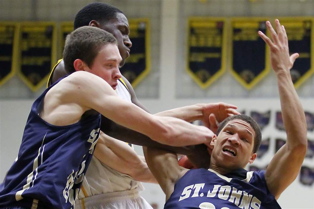 St. John's Jesuit's Trevor Walsh (22) and Tyler Thompson (20) battle Whitmer's Nigel Hayes (23) for a rebound.