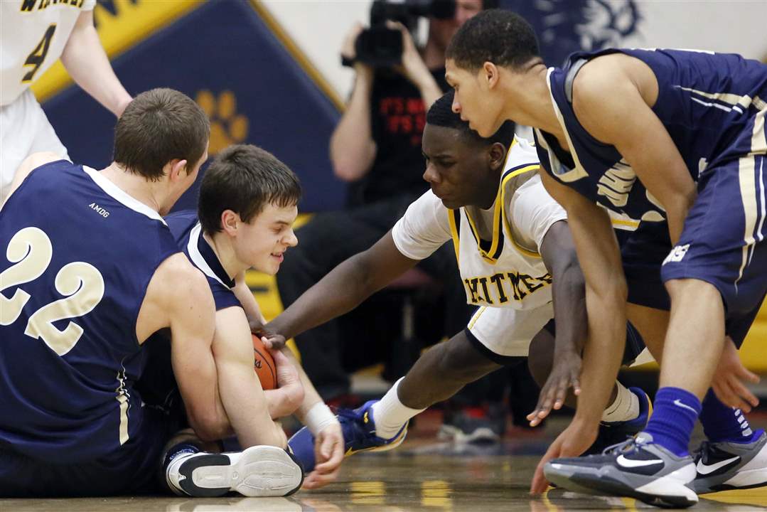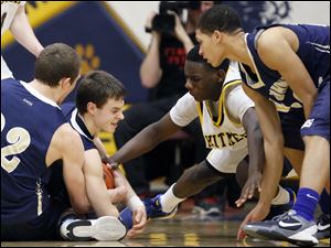 St. John's Jesuit's Trevor Walsh (22) and Austin Gardner (10) battle Whitmer's Jon Ashe (22) for a loose ball.