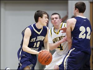 St. John's Jesuit's Austin Gardner (10) drives as teammate Trevor Walsh (22) sets a pick on Whitmer's Luke Hickey.