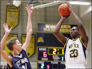 Whitmer's Nigel Hayes (23) takes a shot against St. John's Jesuit's Parker Ernsthausen (24).