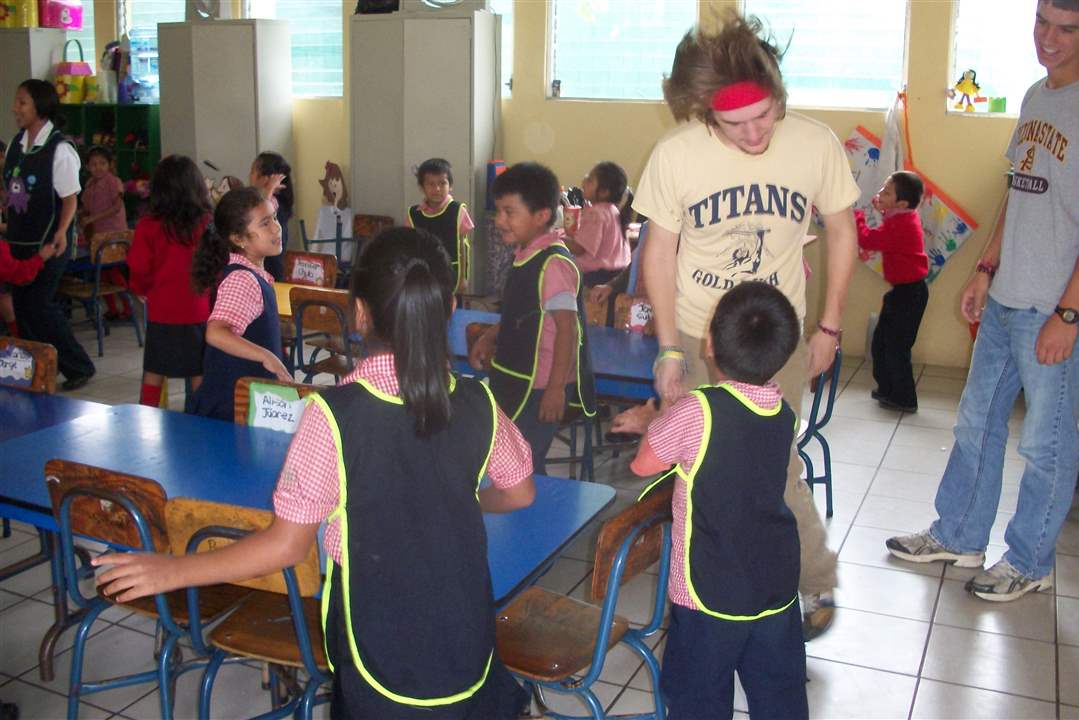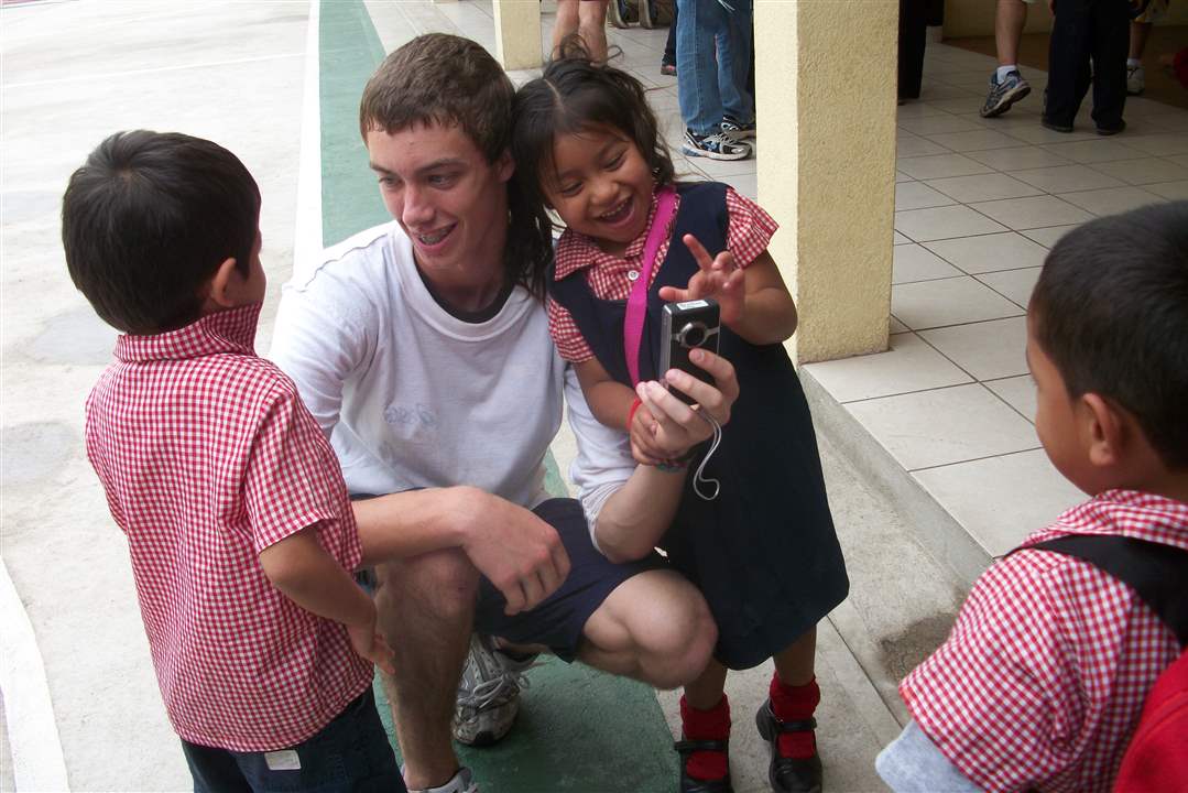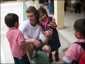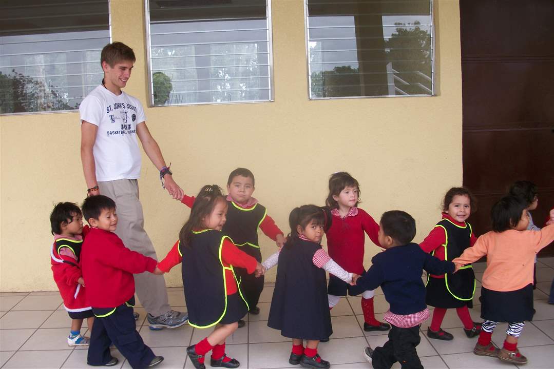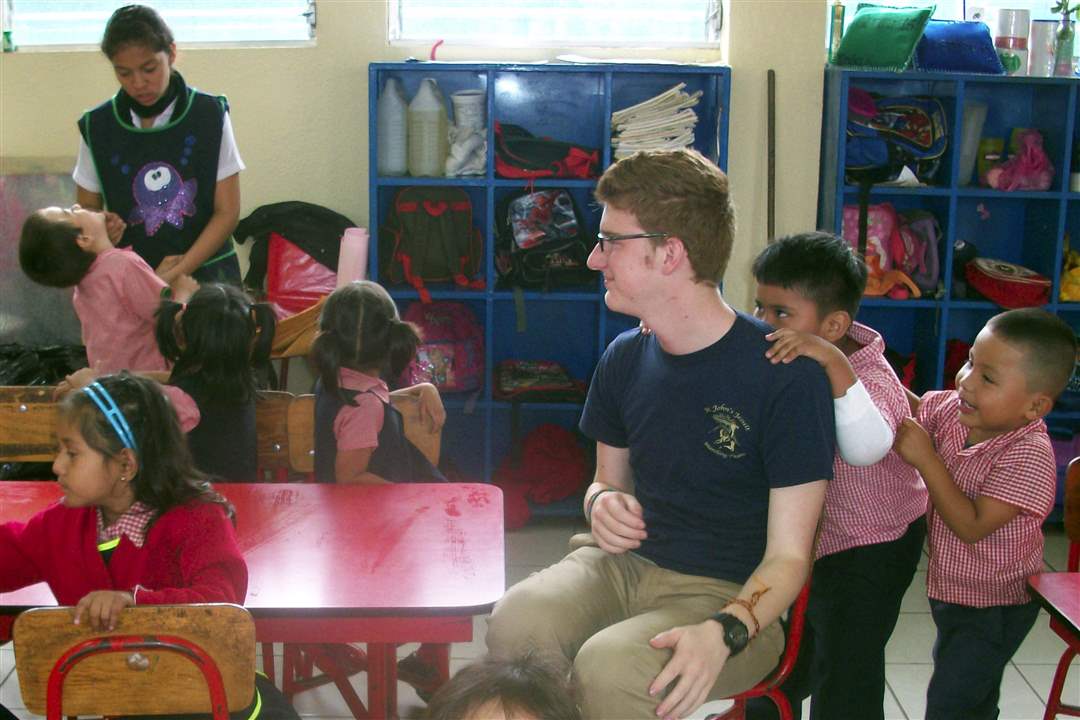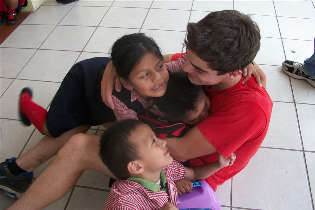 Guatemalan schoolchildren hang on to St. John's student Sean Burlingame, who said they made him feel like Justin Bieber.