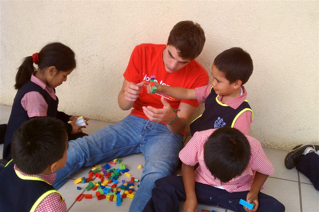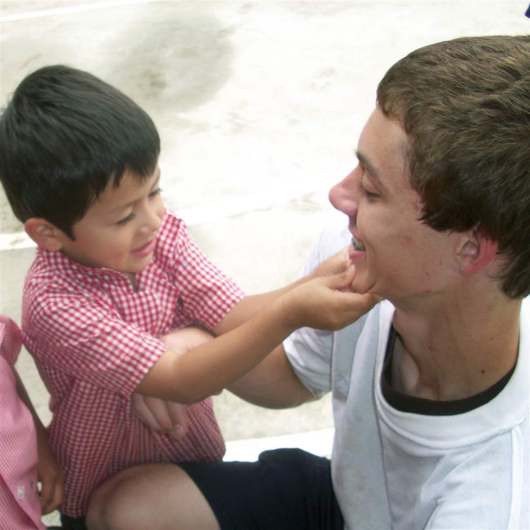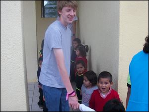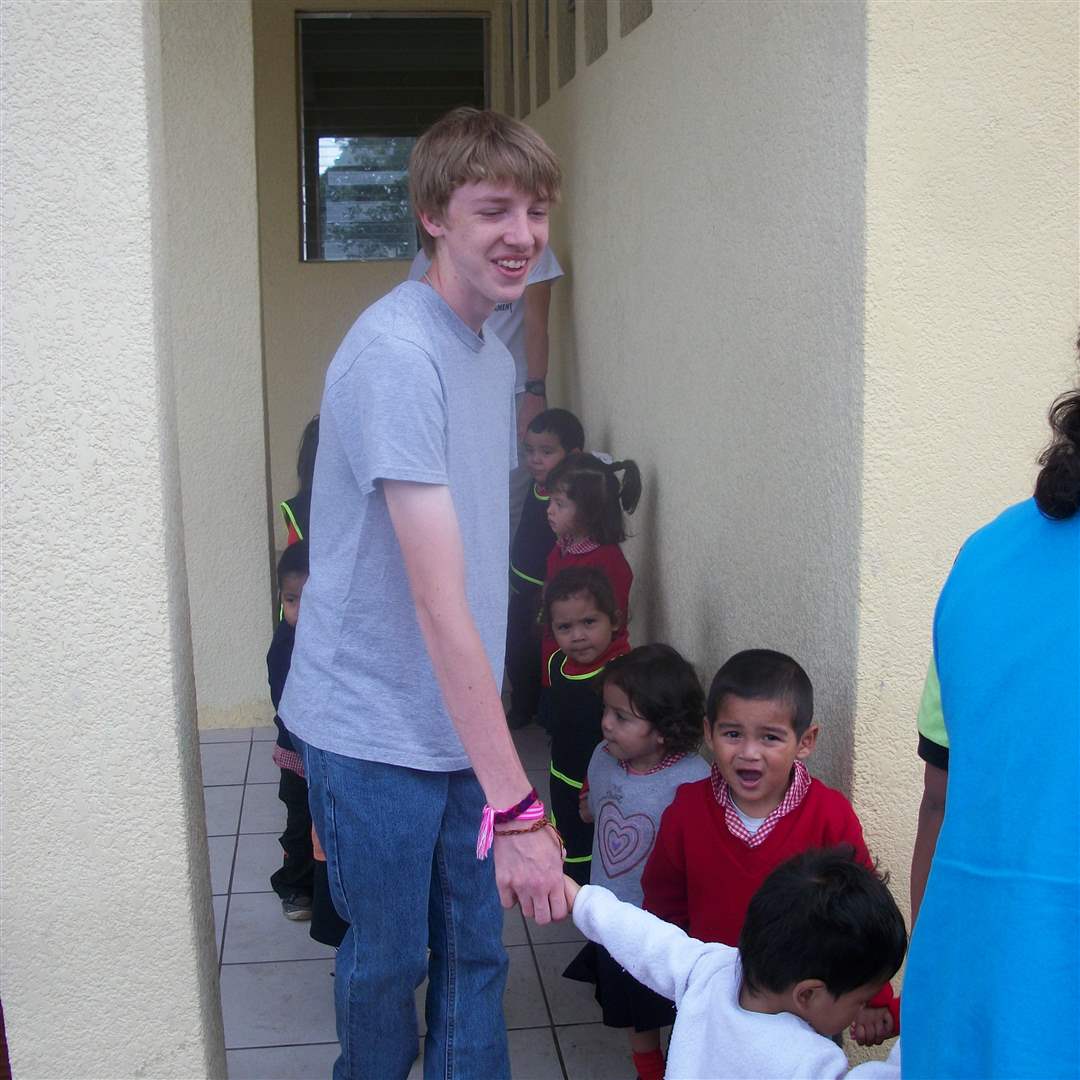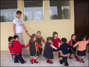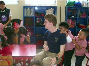 Guatemalan schoolchildren hang on to St. John's student Sean Burlingame, who said they made him feel like Justin Bieber.