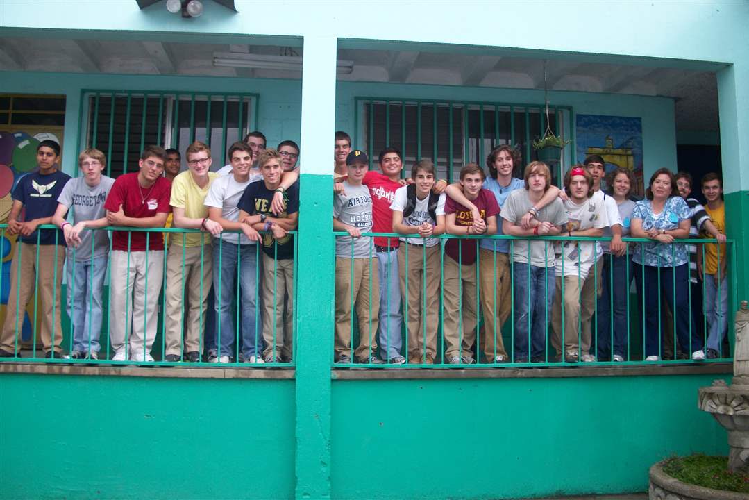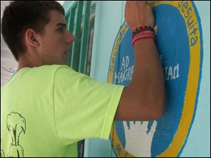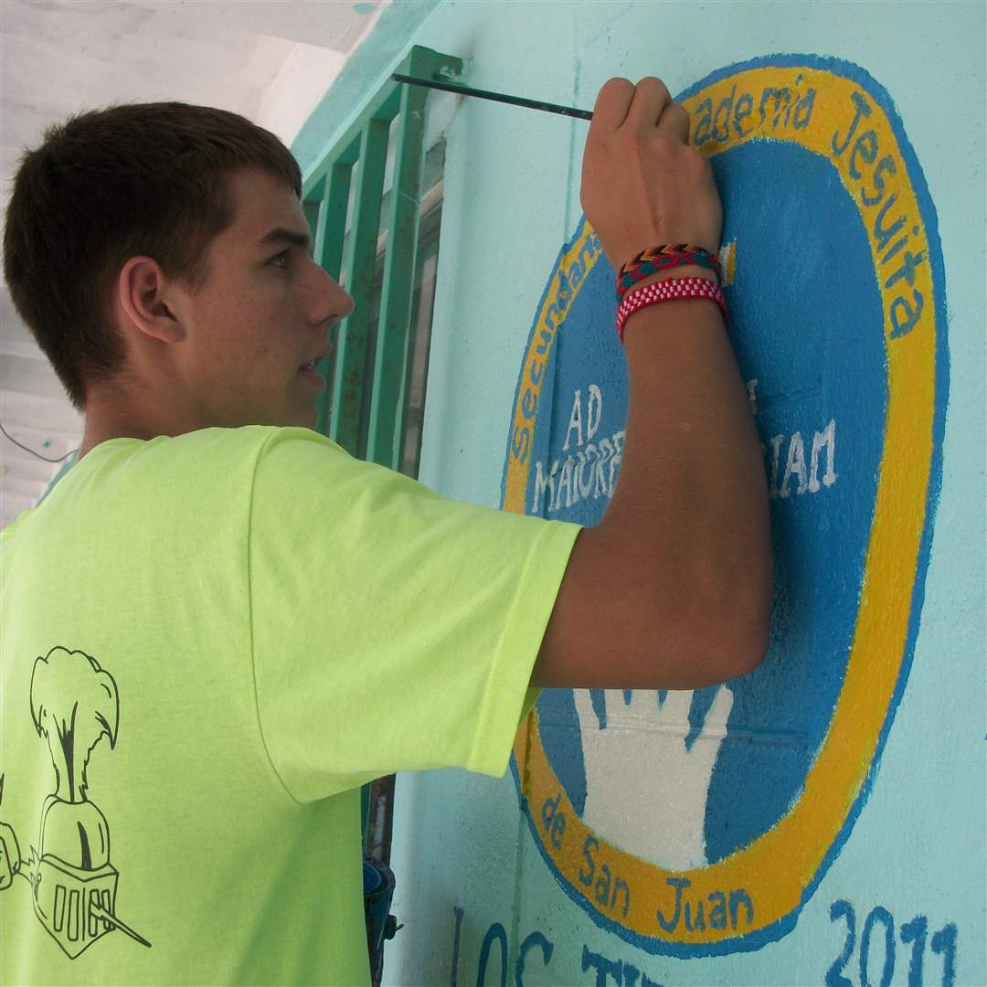 Mike Pool, 17, one of the few visiting St. John's students fluent in Spanish, paints a Spanish version of St. John's logo -- "Los Titanes" for "The Titans" -- on a courtyard wall at the Francisco Coll grade school in Guatemala City.