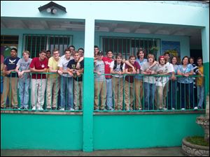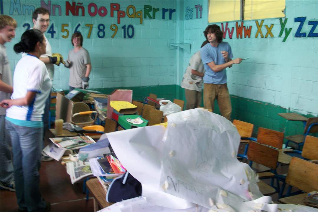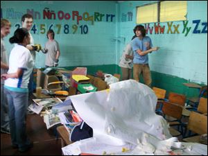 Students and teachers from St. John's Jesuit High School gather inside the Francisco Coll grade school, where they knocked out crumbling parts of cement-block walls and painted the classrooms.
