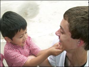 Students at Santa Clara nursery were curious about the braces on the teeth of Mark Brahier, a visiting high school student from St. John's.