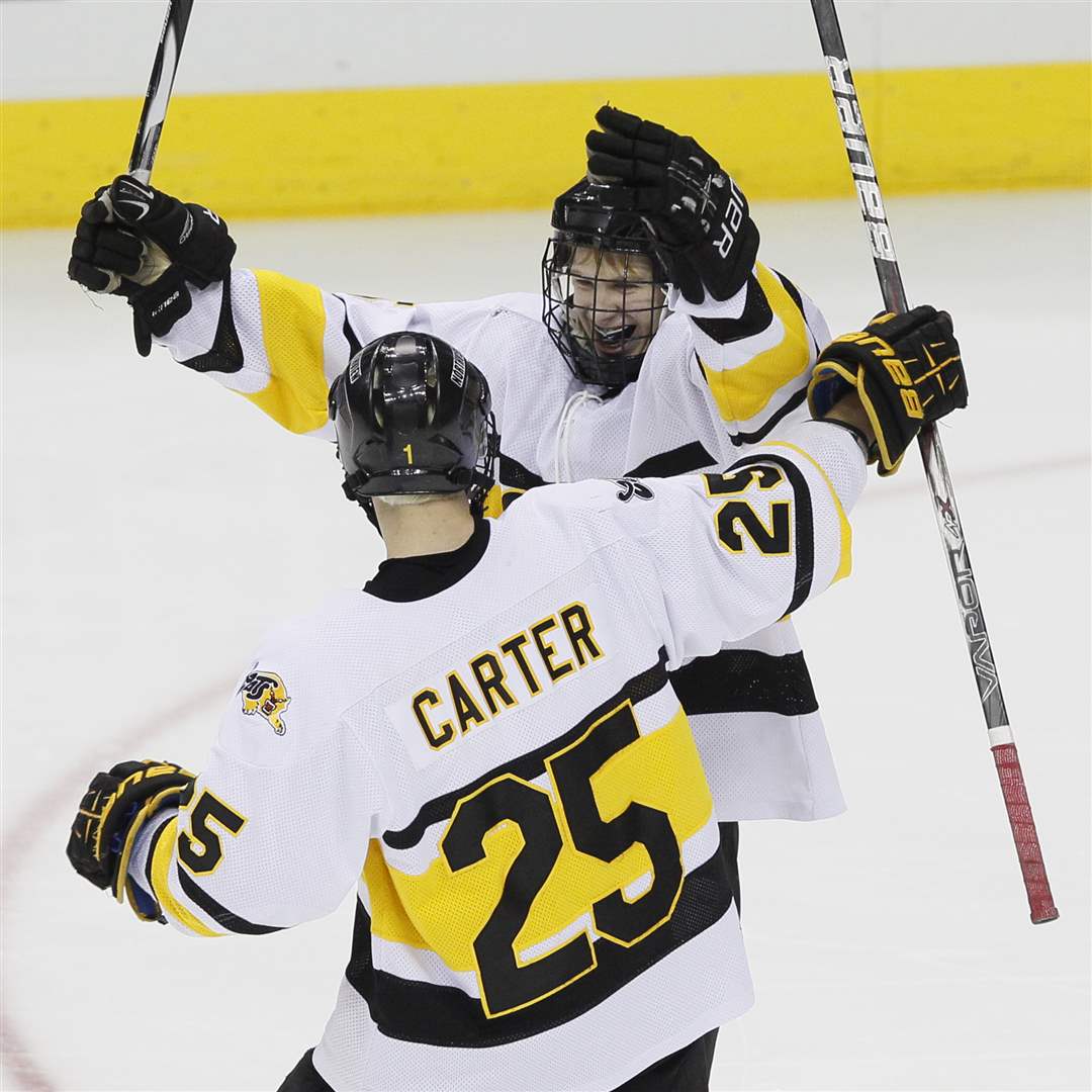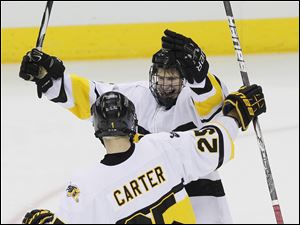 Sylvania Northview players Dalton Carter (25) and Drew Crandall (15) celebrate defeating Olentangy Orange during a state semifinal hockey game Saturday, 03/10/12, at the Nationwide Arena in Columbus, Ohio. Northview defeated Olentangy 6-0.