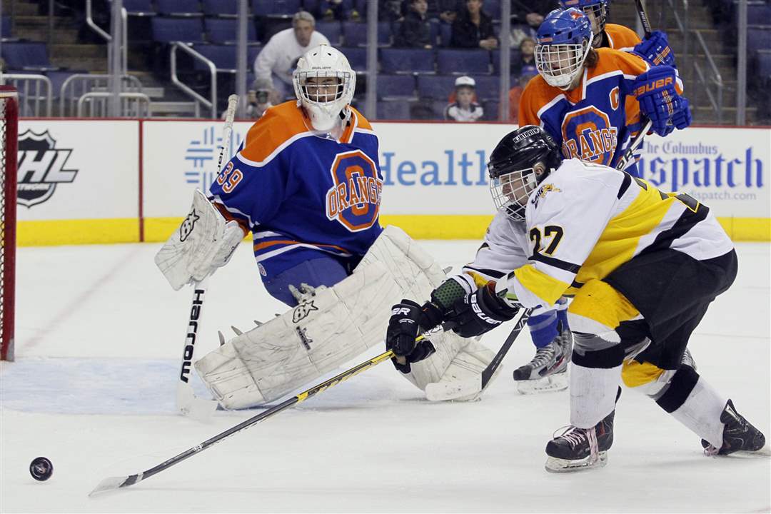 Olentangy Orange goalie Clay Horvath (39) and Tyler Brumfield (17) defend the net against Sylvania Northview's Brady Storer (21) during a state semifinal hockey game Saturday, 03/10/12, at the Nationwide Arena in Columbus, Ohio. Northview defeated Olentangy 6-0.