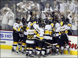 Sylvania Northview players celebrate defeating Olentangy Orange 6-0 during a state semifinal hockey game Saturday, 03/10/12, at the Nationwide Arena in Columbus, Ohio.