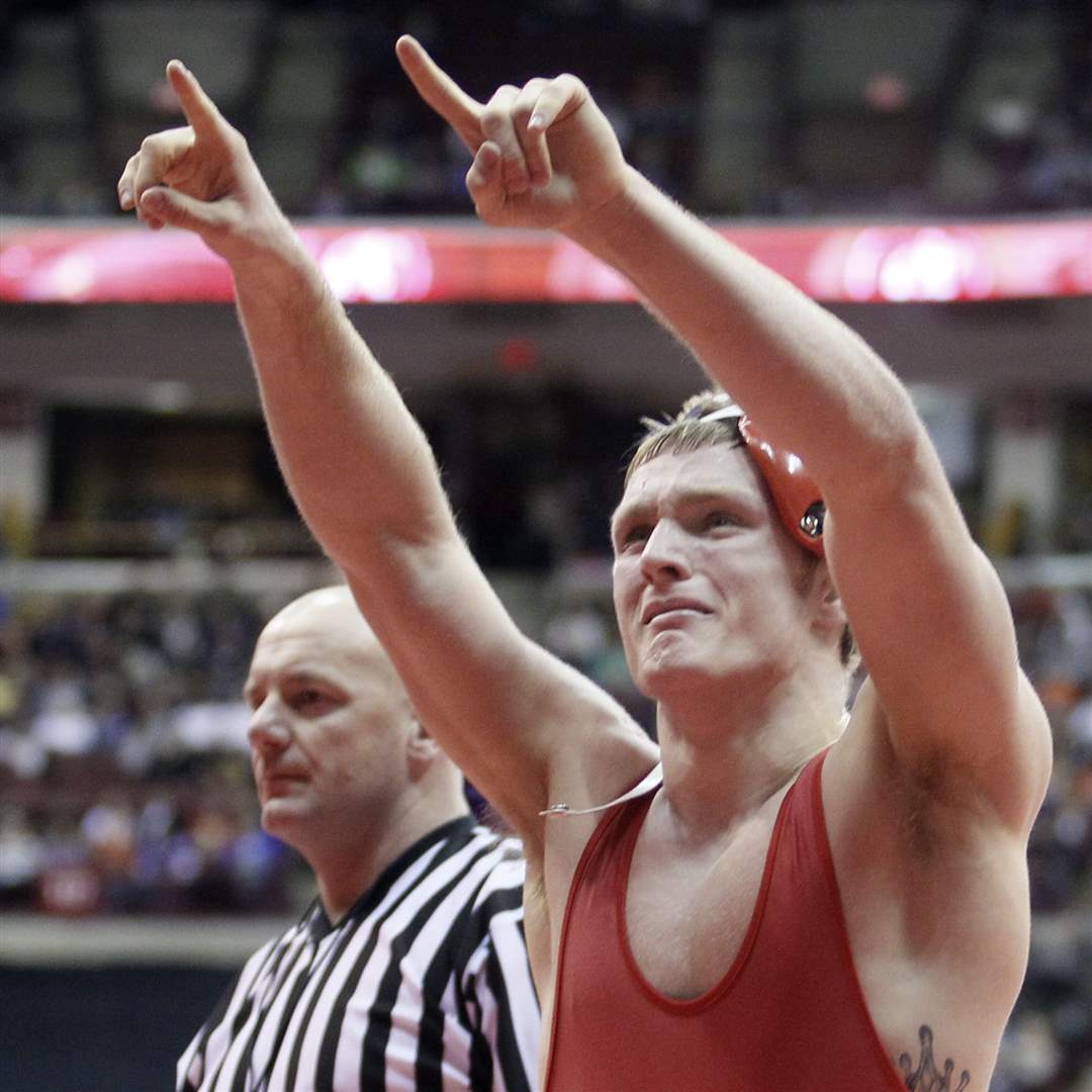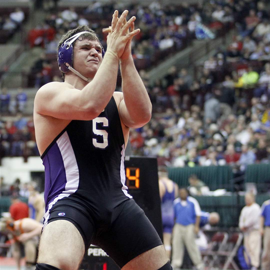 Mimmo Lytle of Swanton celebrates after pinning Aaron Silverio of Shadyside during a Division III 285 pound semifinal match.