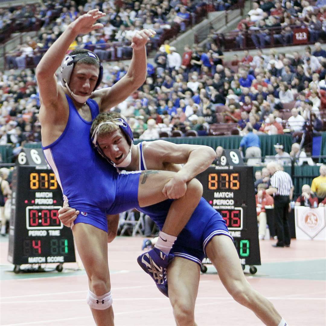 Ian Miller of Oak Harbor takes down Andrew Higgins of Hilliard Bradley during a Division II 152 pound semifinal match. Miller won by technical fall.