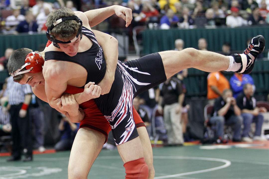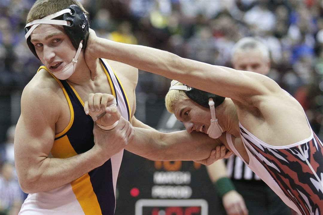 Jake Cramer of Oak Harbor grapples with Paul Gryniuk of Washington C.H. during a Division II 171 pound semifinal match. Cramer won.