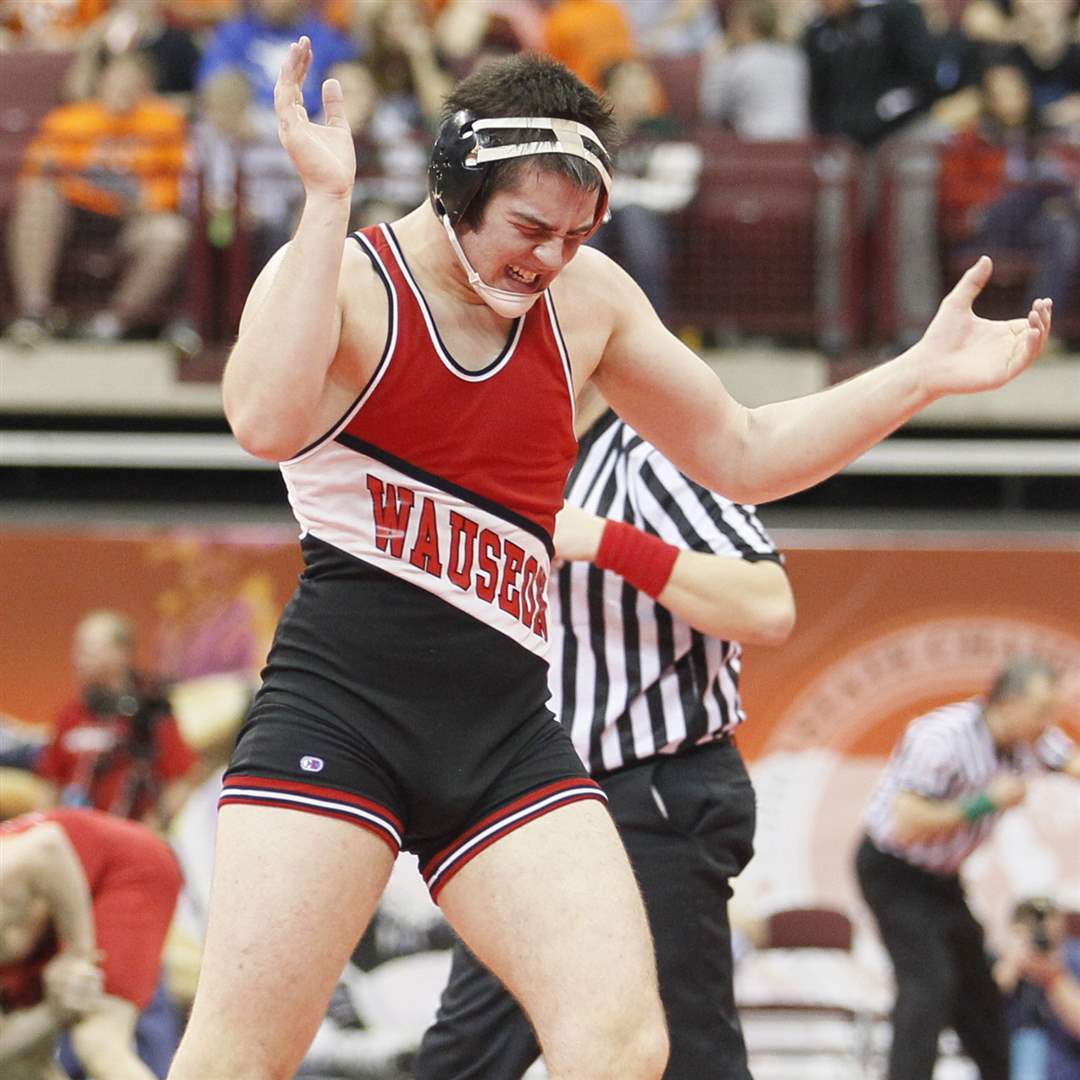 Zane Krall of Wauseon defeats Ray Stone of Akron St. Vincent-St. Mary in a 220 pound semifinal match during the Division II semifinal.
