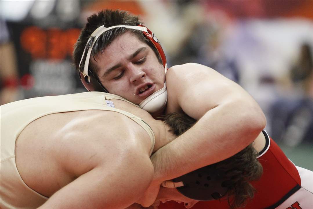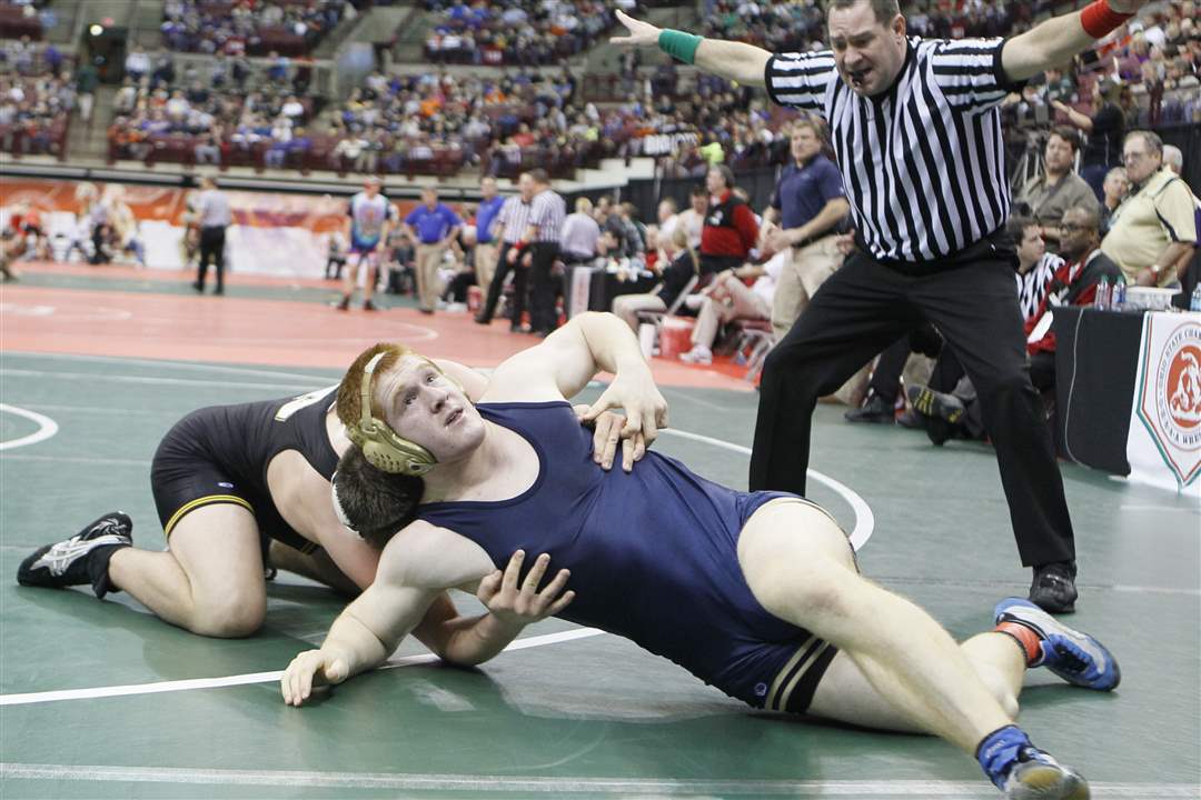 Garrett Gray of Oregon Clay defeats Aaron Pipkins of Maple Heights in a 285 pound semifinal match during the Division I State Wrestling Tournament Thursday, 03/02/12, in Columbus, Ohio.