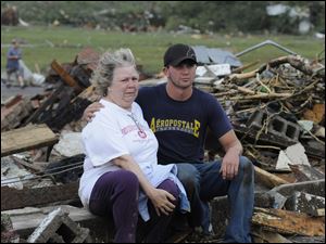 Chase Spradlin, right, comforts Judy Cook after a tornado destroyed her Concord, Ala., home Wednesday.