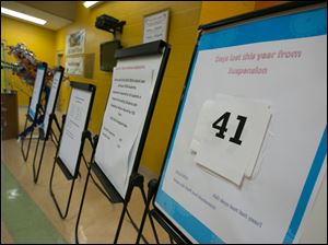 Student teacher Tara Smith, a student at the University of Toledo, helps eighth-grader Willie Mullins with his work.