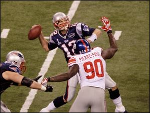 New England Patriots quarterback Tom Brady (12) throws the last pass of the game as New York Giants defensive end Jason Pierre-Paul (90) defends during the second half of the NFL Super Bowl XLVI football game