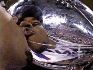 New York Giants wide receiver Devin Thomas kisses the Vince Lombardi Trophy after his team's 21-17 win over the New England Patriots in the NFL Super Bowl XLVI football game, Sunday, Feb. 5, 2012, in Indianapolis.