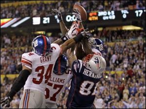 New York Giants safety Deon Grant (34), linebacker Jacquian Williams (57) and safety Kenny Phillips (21) block the final pass to New England Patriots tight end Aaron Hernandez (81) in the NFL Super Bowl XLVI football game, Sunday, Feb. 5, 2012, in Indianapolis.