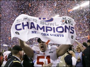 New York Giants long snapper Zak DeOssie (51) celebrates after his team's 21-17 win over the New England Patriots in the NFL Super Bowl XLVI football game, Sunday, Feb. 5, 2012, in Indianapolis.