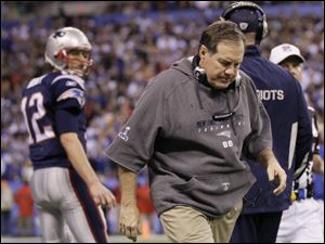 New England Patriots head coach Bill Belichick walks away after talking with quarterback Tom Brady (12) in the closing moments of the Patriots' 21-17 loss to the New York Giants in the NFL Super Bowl XLVI football game, Sunday, Feb. 5, 2012, in Indianapolis.