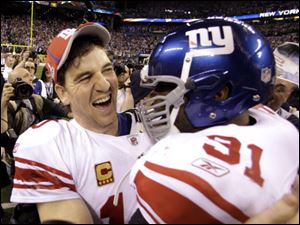 New York Giants quarterback Eli Manning, left, and Aaron Ross celebrate their team's 21-17 win over the New England Patriots in the NFL Super Bowl XLVI football game, Sunday, Feb. 5, 2012, in Indianapolis.