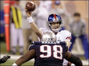 New York Giants quarterback Eli Manning throws a pass over New England Patriots defensive lineman Gerard Warren (98) during the second half of the NFL Super Bowl XLVI football game, Sunday, Feb. 5, 2012, in Indianapolis.