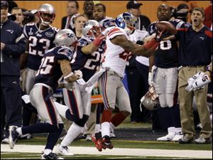 New York Giants wide receiver Mario Manningham catches a pass as New England Patriots defensive back Sterling Moore (29) and safety Patrick Chung (25) defend during the second half of the NFL Super Bowl XLVI football game, Sunday, Feb. 5, 2012, in Indianapolis.