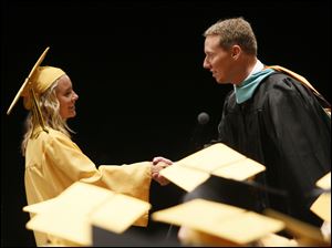 After receiving her diploma, Kira Messing of Northview High School, is congratulated by Principal Steve Swaggerty during the school's graduation ceremony at the Stranahan Theater.