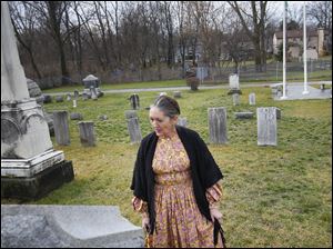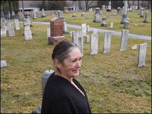 Sylvania Area Historical Society board member Mimi Malcolm inspects the inscription on a tombstone while talking about the Sylvania Association Cemetery as she walks through the area on Saturday, Jan. 19, 2012. When she started doing genealogical research in 1995 Malcolm realized she has ties to several of the founding families in the Sylvania area.