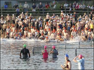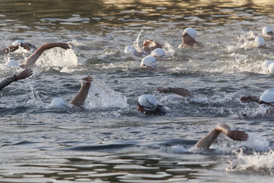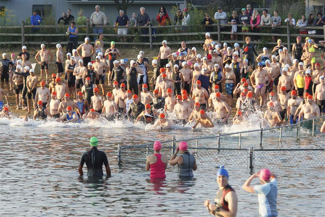 Swimmers on the beach shortly before the races begin. Different colored swim caps denote different categories of participants.