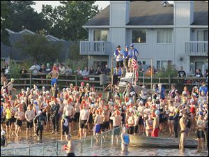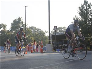 Phillip Clauda of Blue Ash, Ohio, right, and other riders as they start the bike portion of the event.