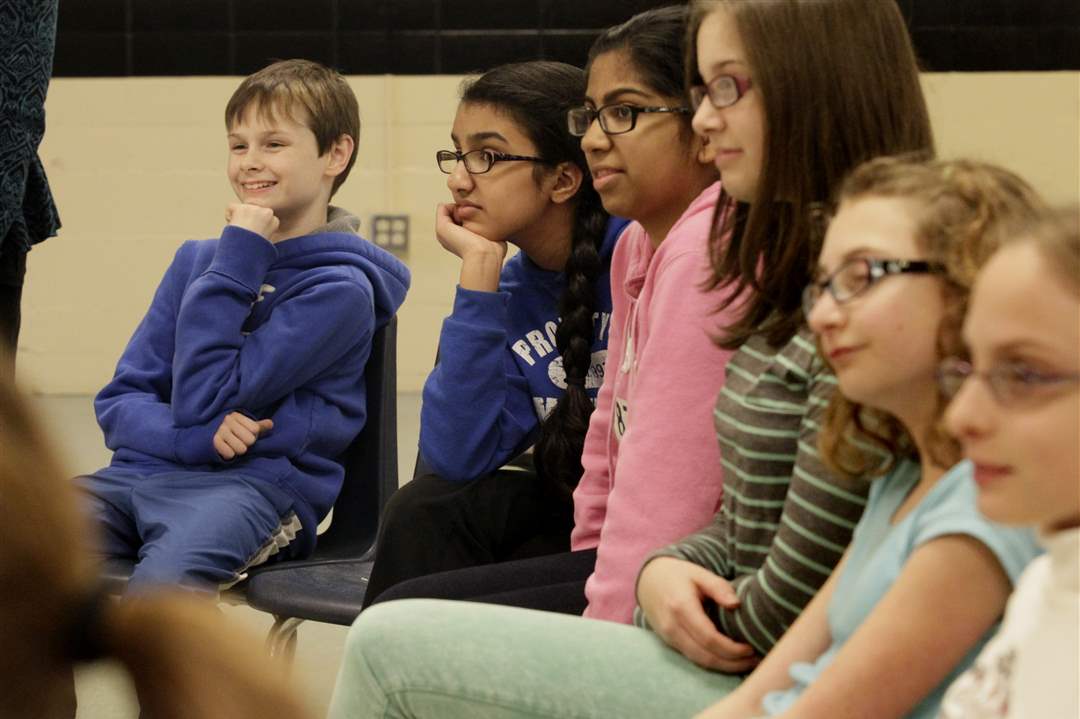 Lynley Acres, 12, left, Cassie McCloskey, 11, center, and Jason Rogers, 12, right, watch as two of their fellow students perform a short skit.