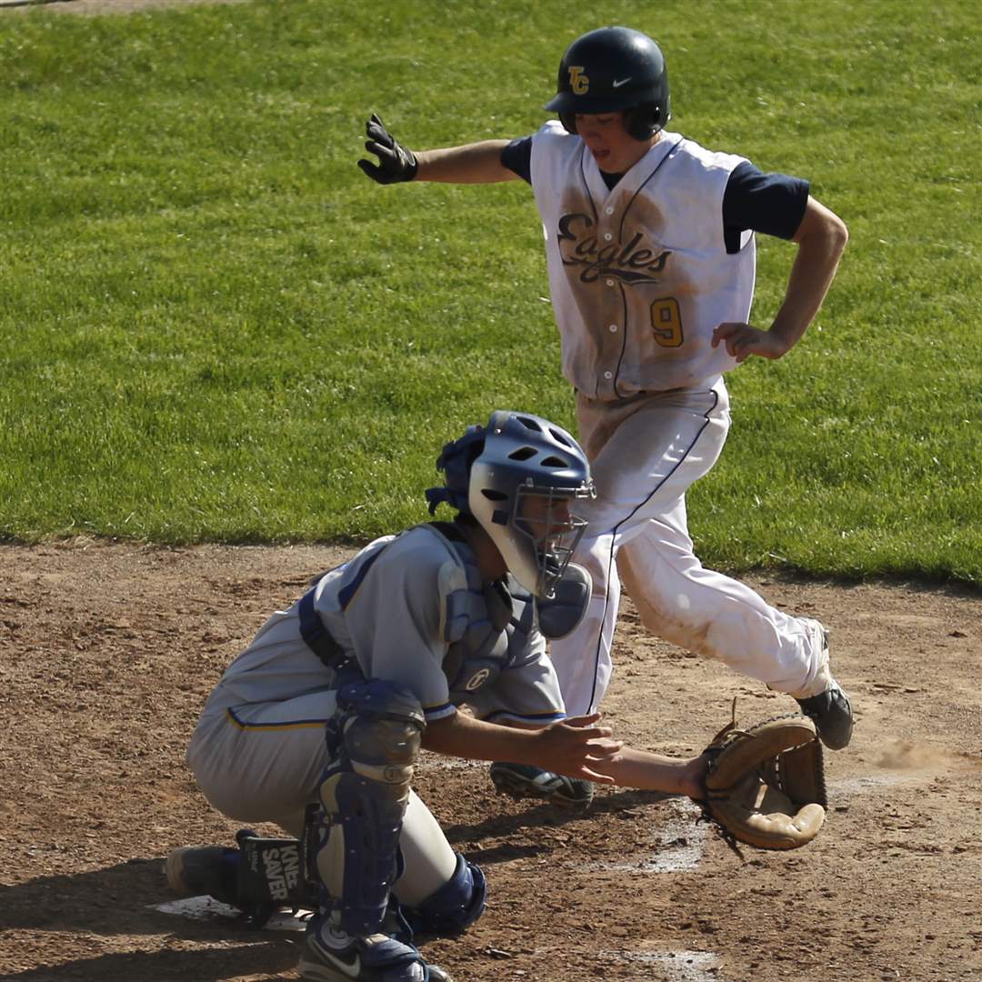 Northwood catcher Evan Perkins waits for the ball as Toledo Christian's Cody Gibson heads for the plate.