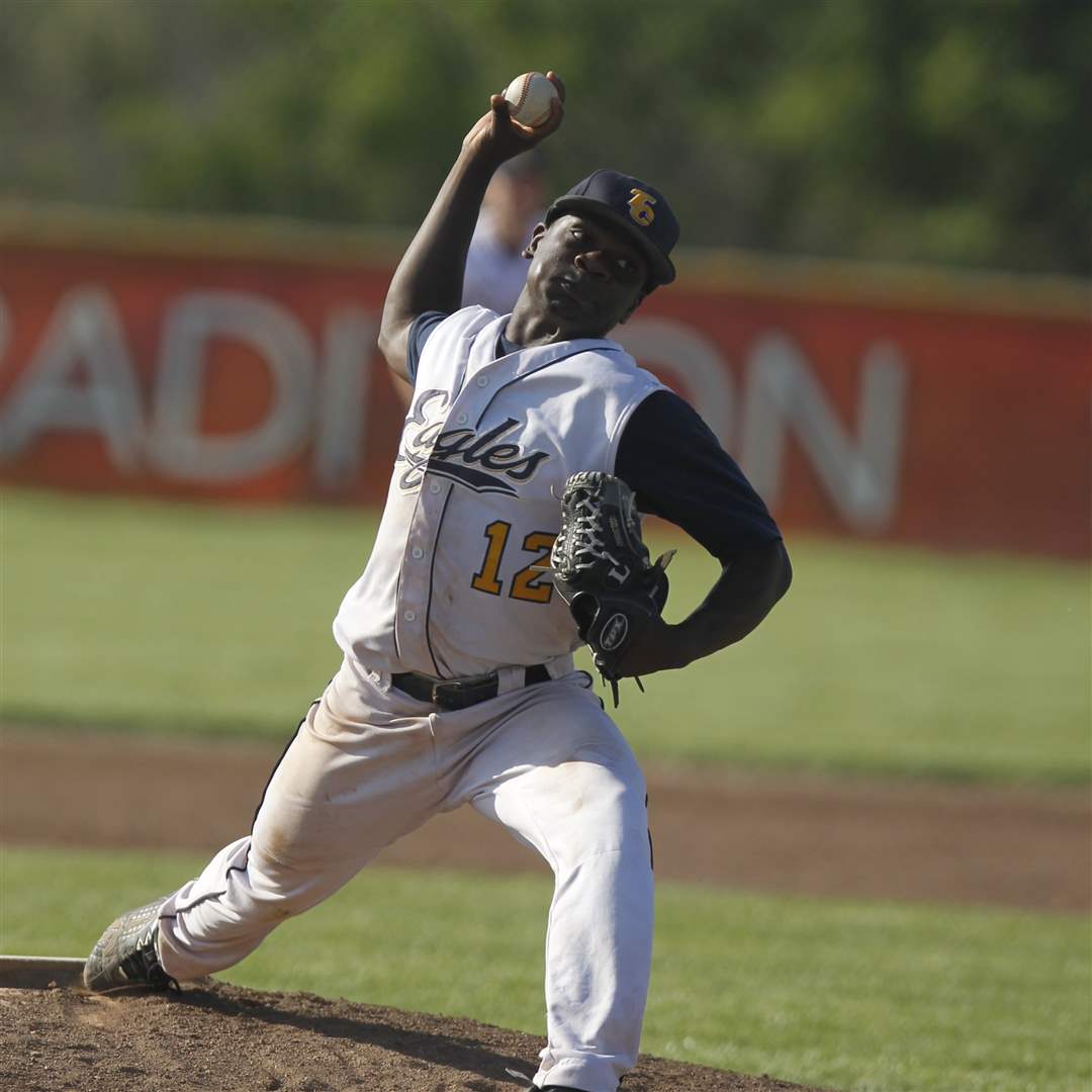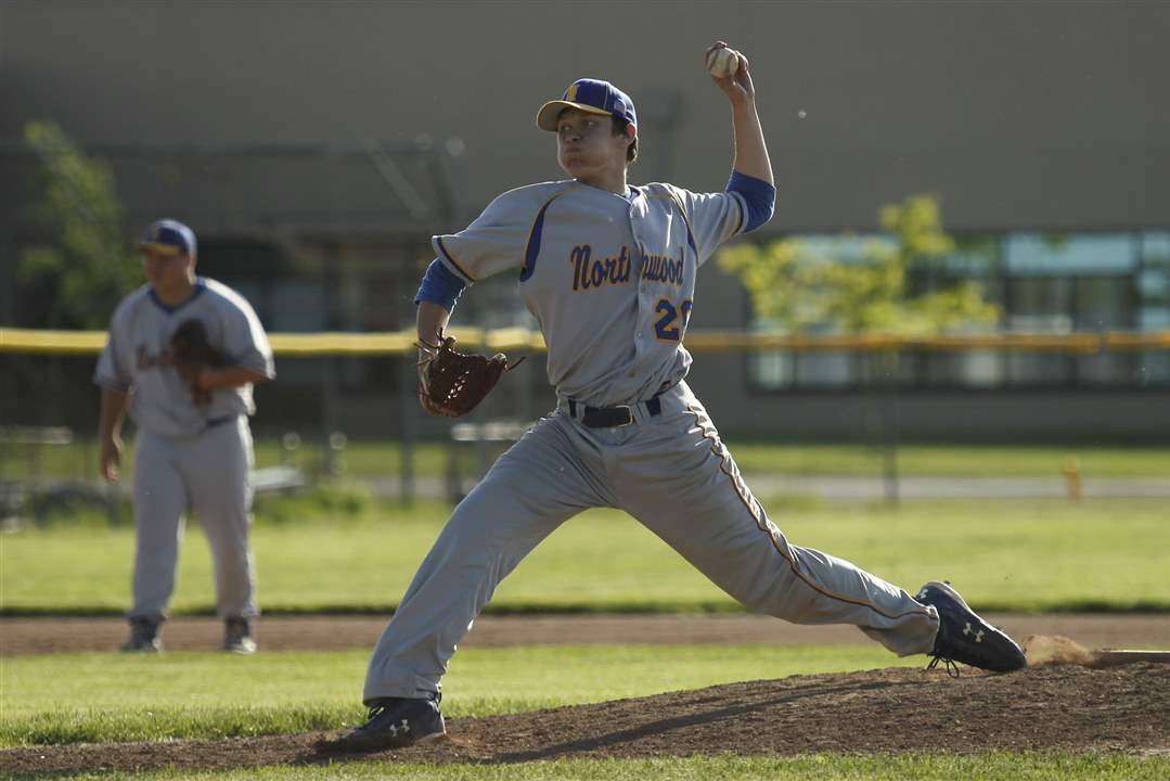 Northwood pitcher Cameron Juhasz pitches against Toledo Christian. He struck out 13 batters and tossed a no-hitter, but the Rangers fell to the Eagles 4-1 in the TAAC championship game. The teams will share the title.
