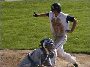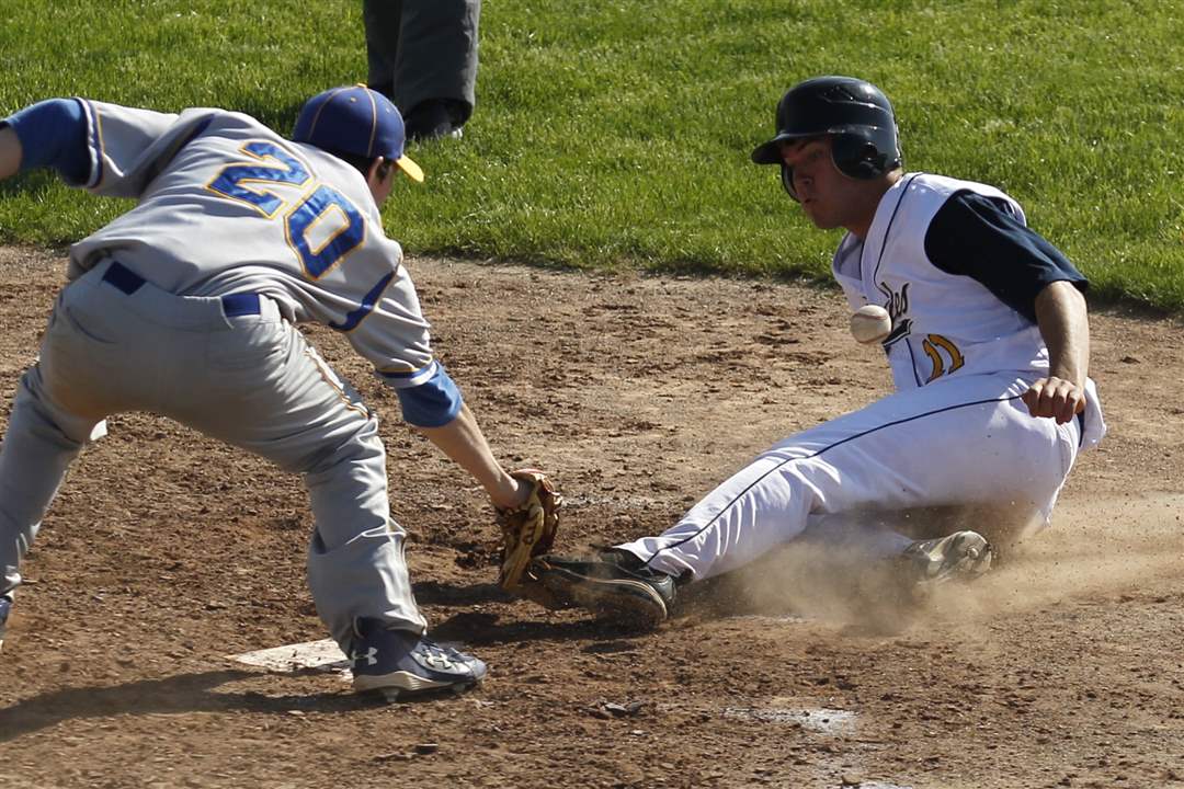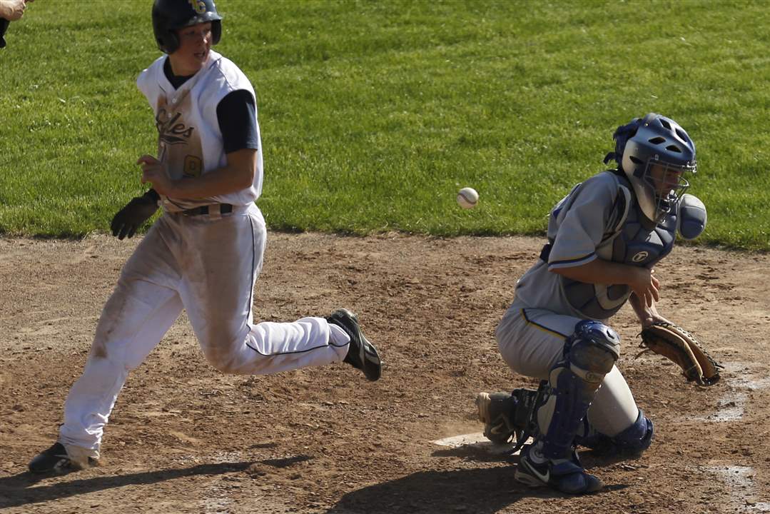 Northwood catcher Evan Perkins misses the throw, allowing Toledo Christian's Cody Gibson to score.