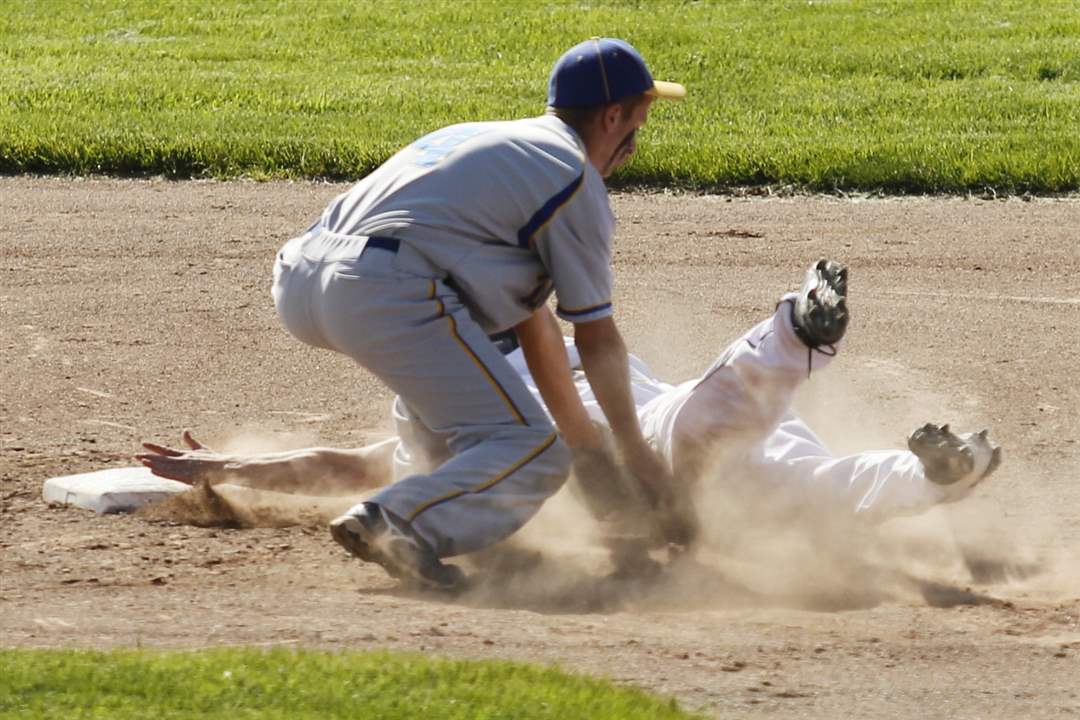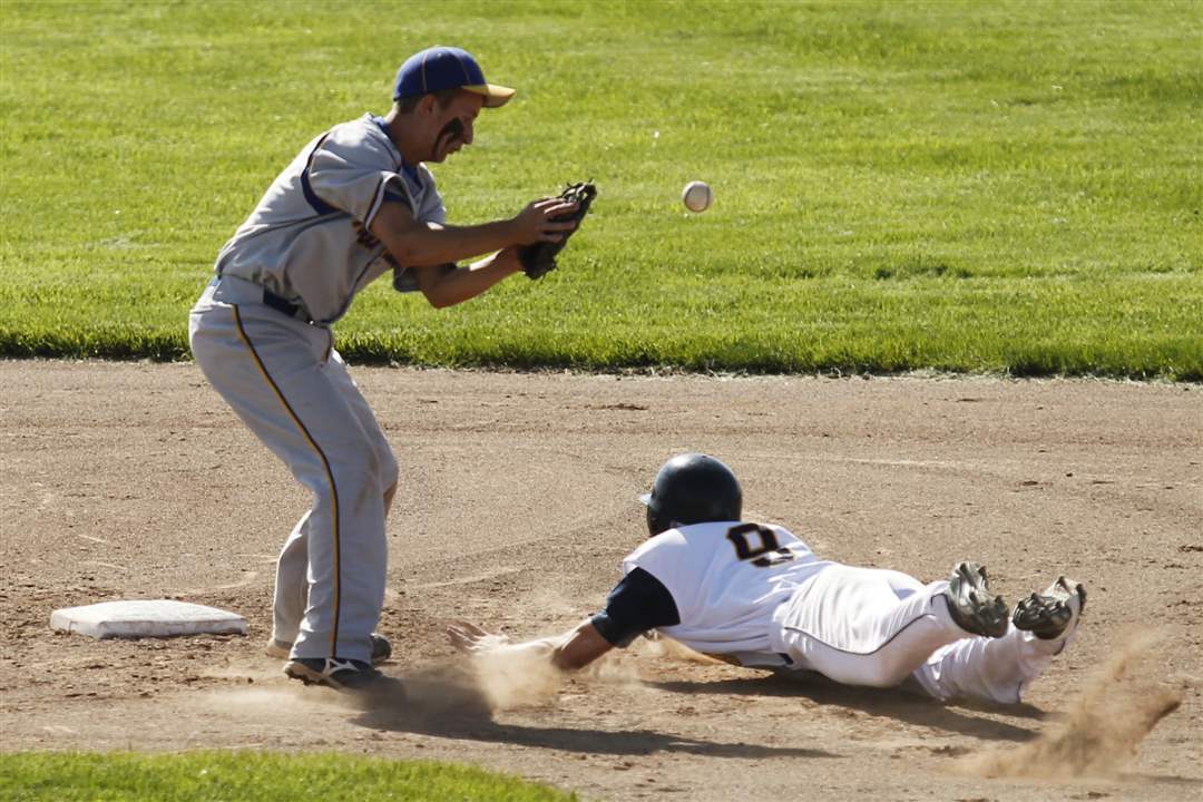 Toledo Christian's Cody Gibson to reach second base safely as Northwood's Nick Russell misses a throw.