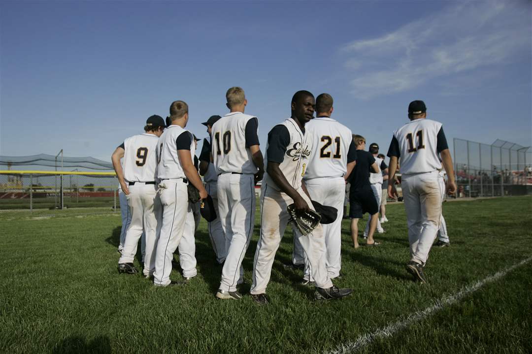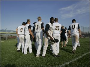 Toledo Christian pitcher Mark Salisbury, center, and his team break up from a huddle after defeating Northwood 4-1 during the TAAC championship game at Owens Community College. The Eagles will share the title with the Rangers.