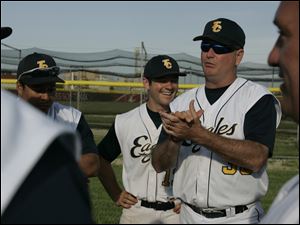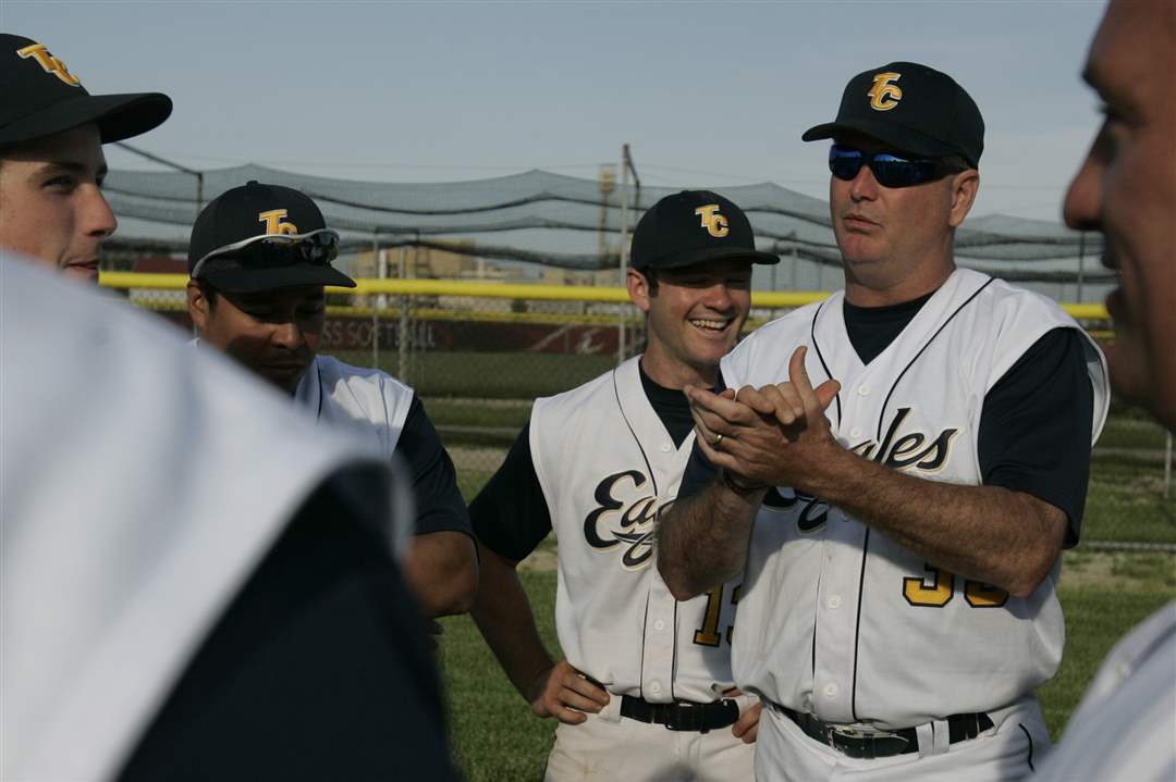 Toledo Christian head coach Ron Rightnowar applauds his team after they defeated Northwood for a share of the TAAC baseball crown.