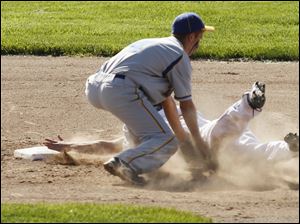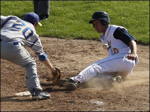 Northwood pitcher Cameron Juhasz misses the tag on Toledo Christian's David Westmeyer during the TAAC baseball championship game at Owens Community College.