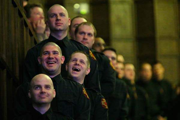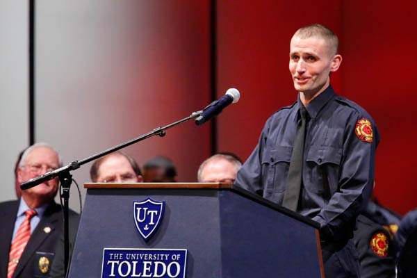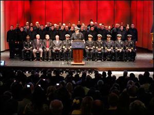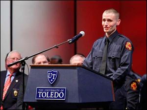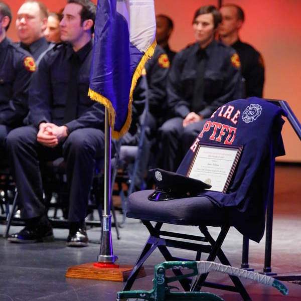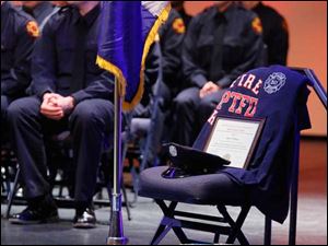 CTY GRADUATION22p An empty chair for James Dickman sits on stage during a graduation ceremony for the Toledo Fire Department at the University of Toledo's Doermann Theatre, Friday, February 21, 2014. Mr. Dickman died in the line of duty in January. THE BLADE/ANDY MORRISON