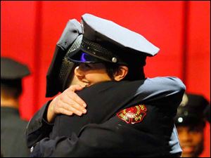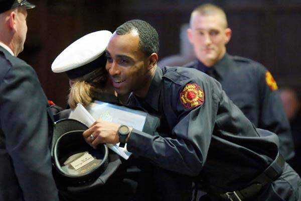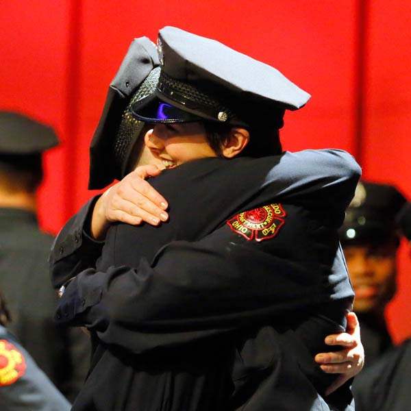 Antwoine Mister hugs Battalion Chief Sally Glombowski after receiving his hat.