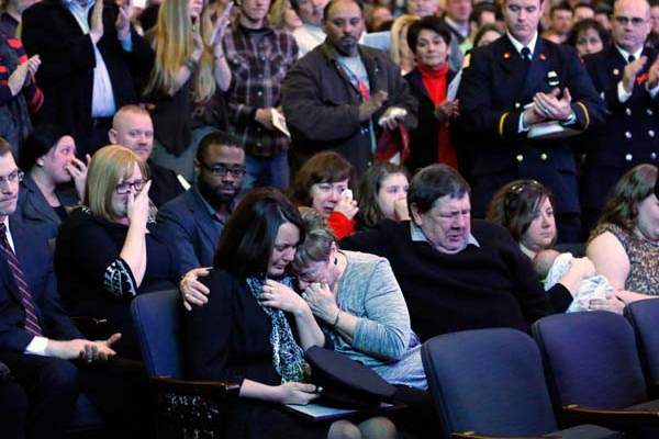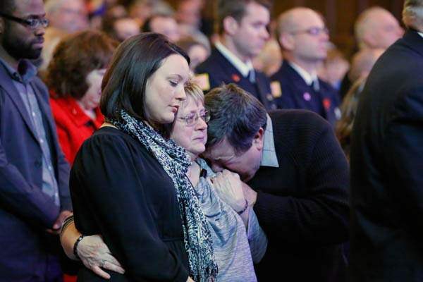 Jamie Dickman, wife of firefighter James Dickman, along with with his parents Linda and Greg Dickman, are overcome with emotion as they are given a standing ovation.