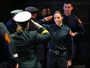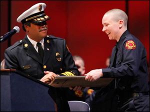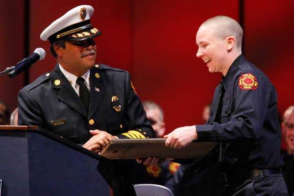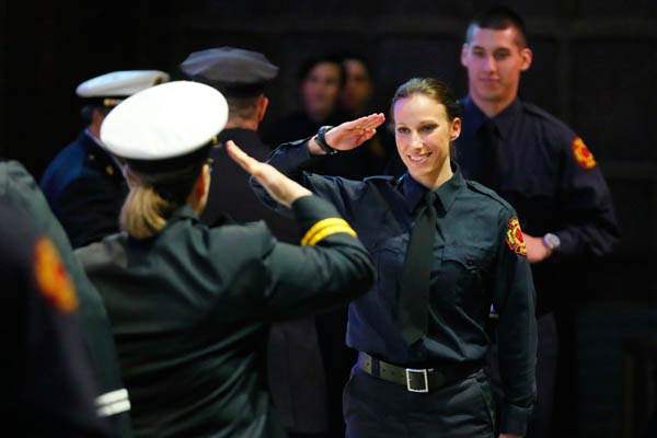 Sarah Rowe, right, salutes Battalion Chief Sally Glombowski.