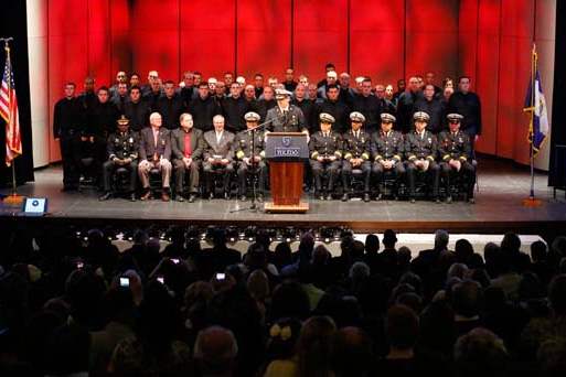 Chief Luis Santiago jokes with Amanda Lyons as she accepts the John H. Brancheau Award. She and James Dickman, who was killed in the line of duty, shared the award.