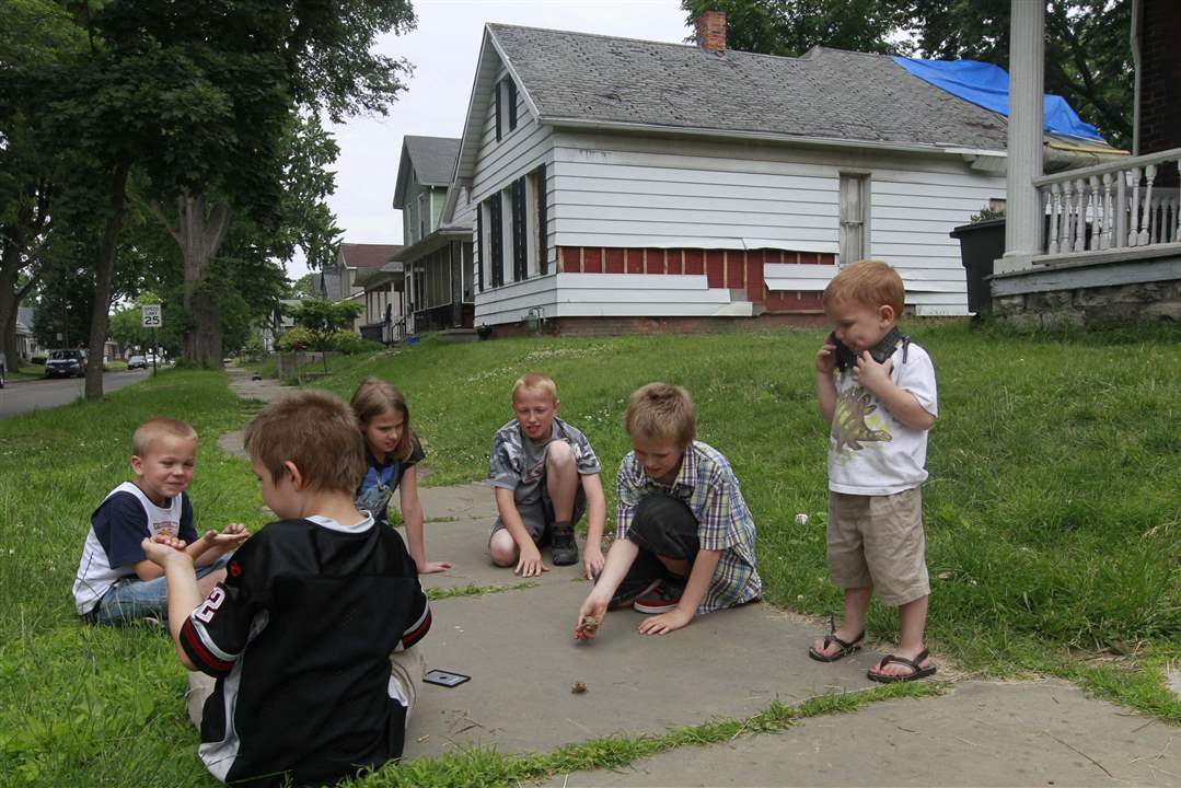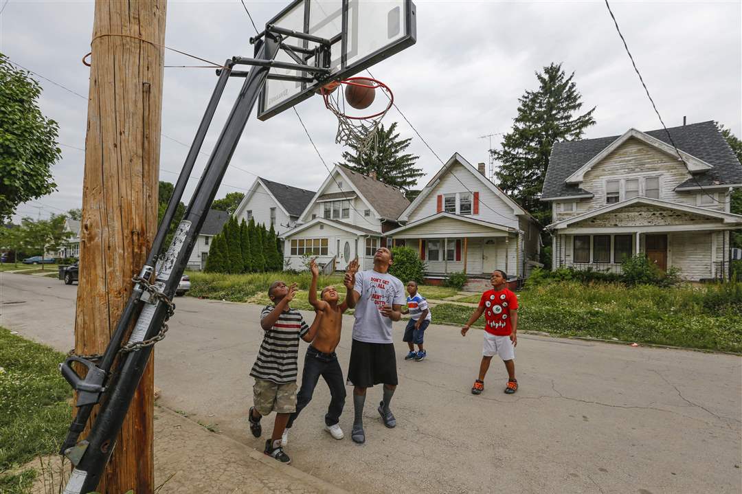 From left, Travares Craig, 10, Trezon Manns, 10, Broderick Goodlow, 14, his cousin Raymond Goodlow, 6, and Terrance Coffey, 9, play basketball in front of a vacant home in the 600 block of Ashwood Avenue.