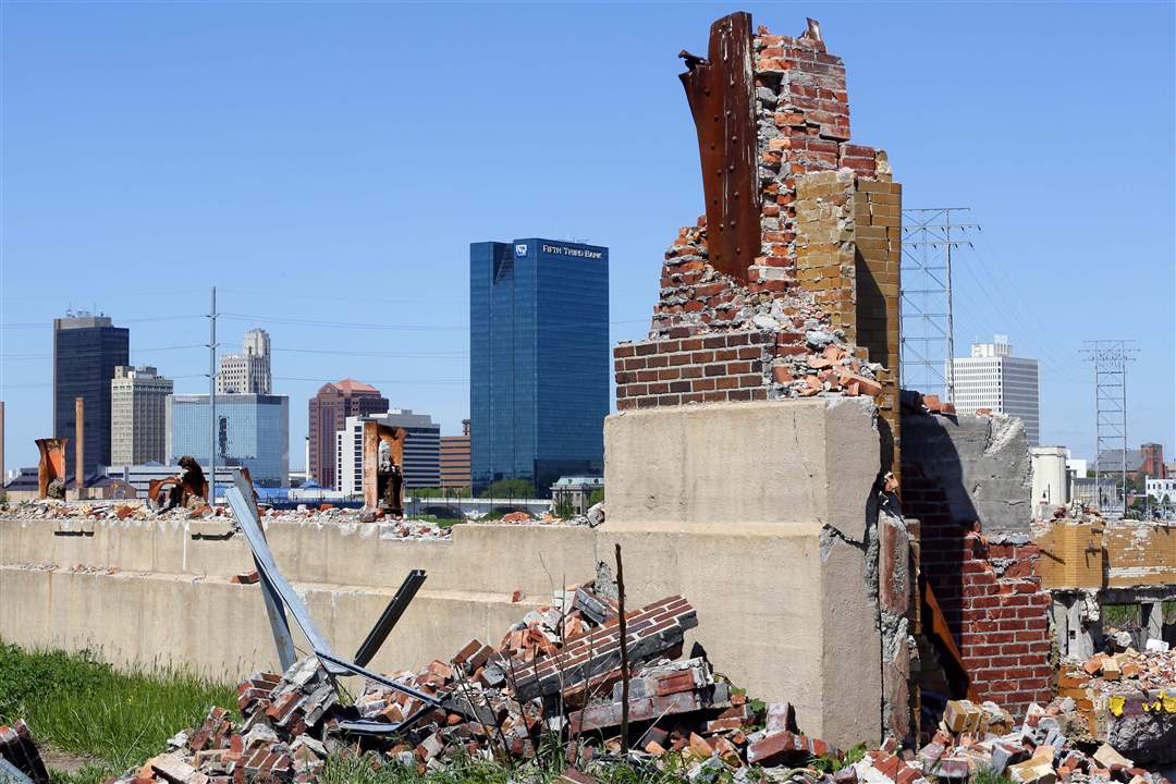 The downtown Toledo skyline is visible behind the remains of the Toledo Edison Acme power plant in the Marina District.