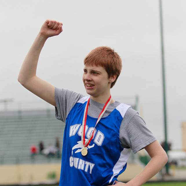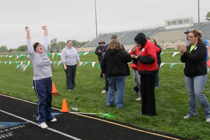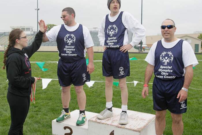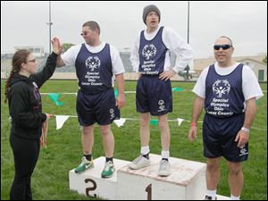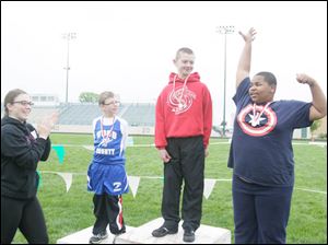 Volunteer Julia Hage, of Sylvania, left, congratulates the top three finishers in the 100 M dash: Jimmy Jackson, of Whitehouse; Robert Mack, of Toledo, and Billy Ball, of Toledo.The three competed in this event as part of the pentathalon.