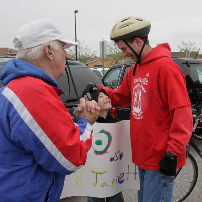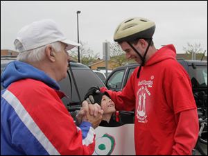 Coach Mike Palmer, of Sylvania, left, tries to get a few words in to bicyclist Jarrett Brann, right, of Oregon, while Brann is congratulated by Xander Shiffert, 9, of Curtice.