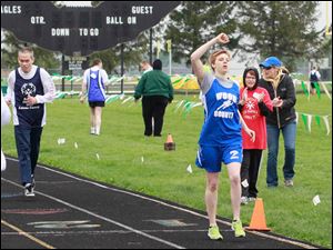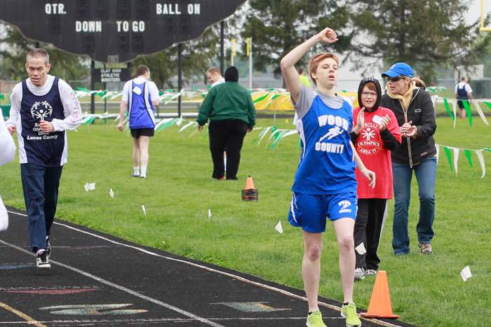 800 meter gold medalist Amanda Gump, of Wayne, crosses the finish line before Edmund Lyons, of Toledo.